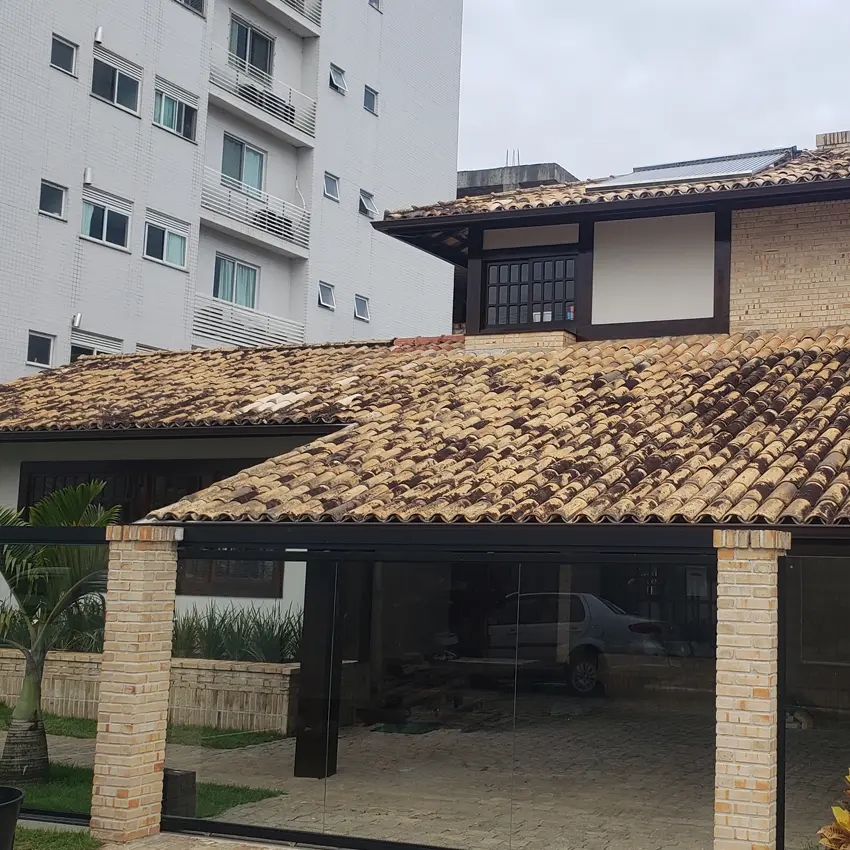 Para residências com coberturas de vidro, como varandas ou jardins de inverno, as calhas sem emendas oferecem um sistema de drenagem eficiente, evitando danos causados por água acumulada e complementando o visual elegante desses espaços.